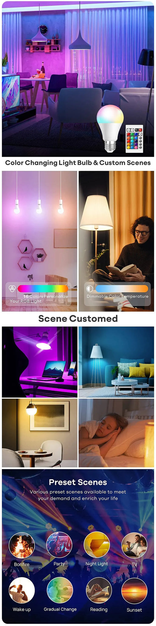 • Dimmable :Adjust the brightness of your lights to suit your mood or activity.